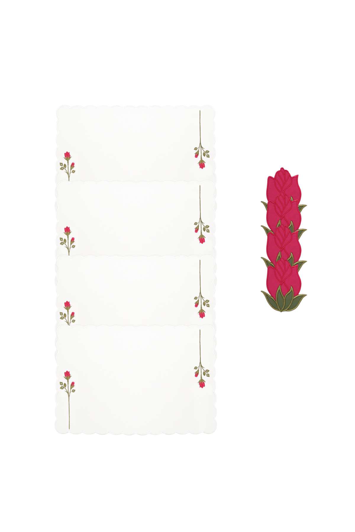 İçerik: Dört adet pembe gül nakışlı Rosie amerikan servisi ve dört adet pembe gül nakışlı bardak altlığı