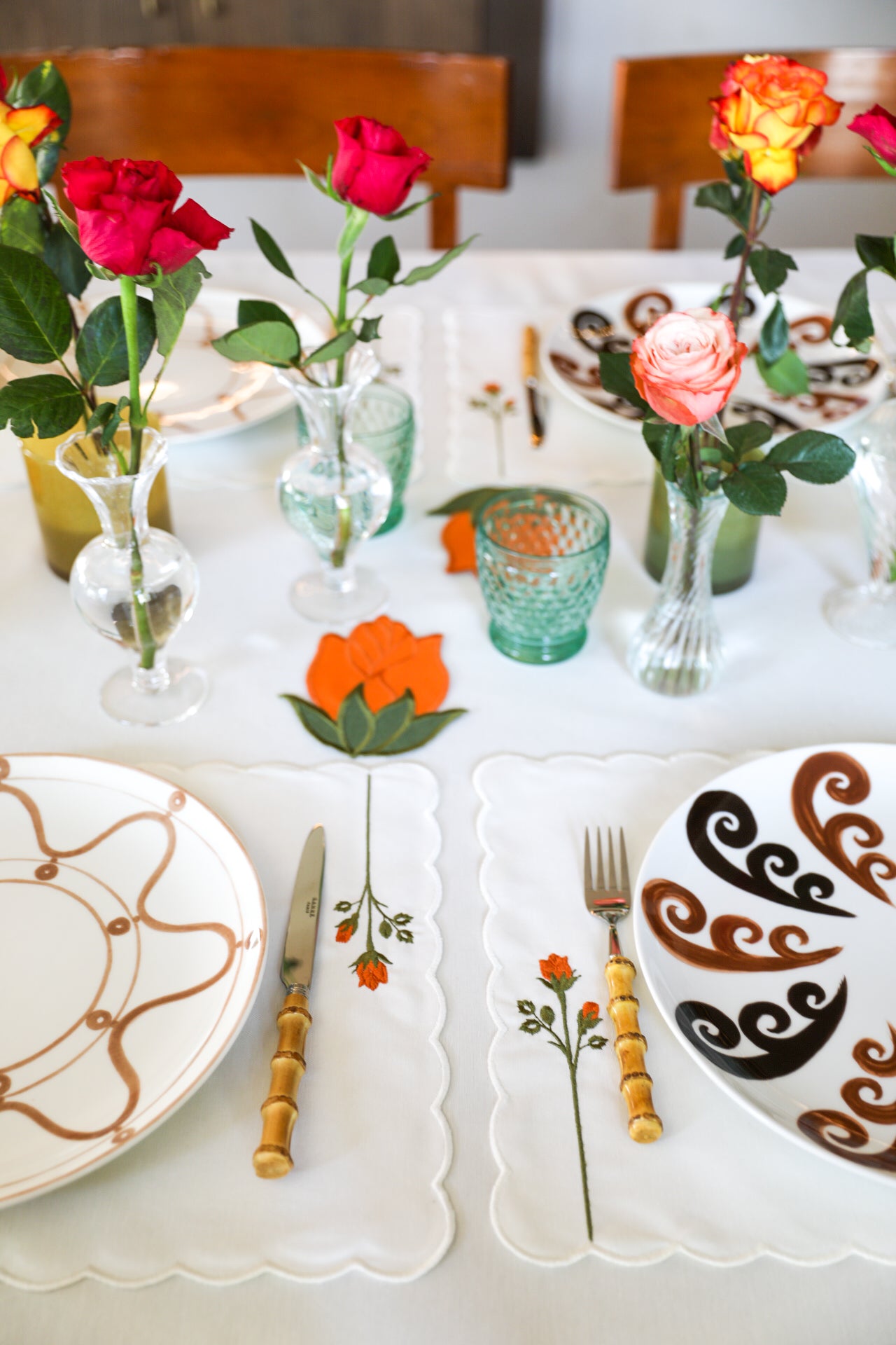 İçerik: Dört adet turuncu gül nakışlı Rosie amerikan servisi ve dört adet turuncu gül nakışlı bardak altlığı